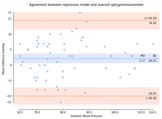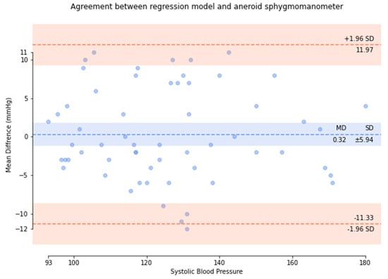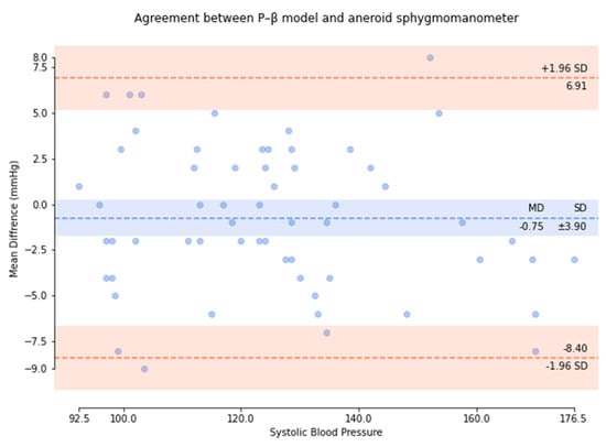 Based on the comparison of the Bland–Altman analysis of SBP (Figure 10), the results of the regression model method indicated a SBP of 0.32 ± 5.94. The results of the P–β model method (Figure 11) indicated an SBP of 0.75 ± 3.9.
