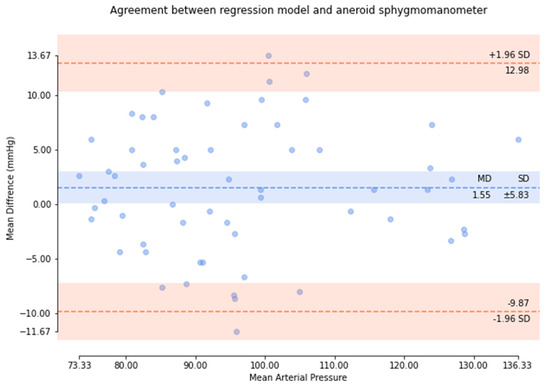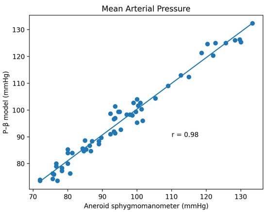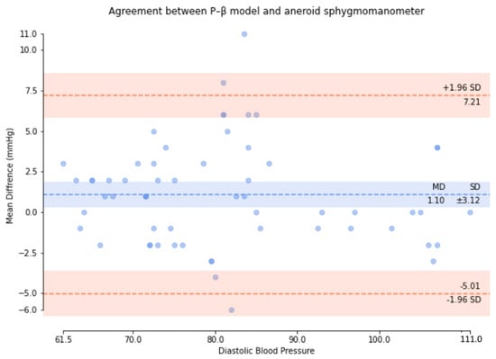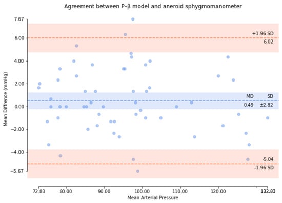 Based on the comparison of the Bland–Altman analysis of MAP (Figure 12), the results of the regression model method indicated a MAP of 1.55 ± 5.83. The results of the P–β model method (Figure 13) indicated a MAP of 0.49 ± 2.82.