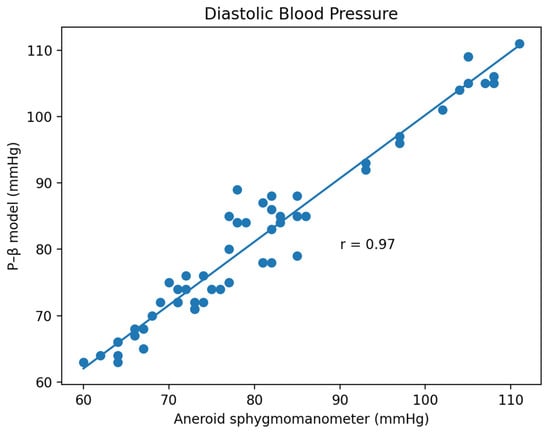 Based on the comparison of the Bland–Altman analysis of DBP (Figure 14), the results of the regression model method indicate a DBP of 2.17 ± 6.22. The results of the P–β model method (Figure 15) indicate a DBP of 1.1 ± 3.12. According to the results, it was found that the dispersion of BP values estimated by the regression model is greater than that of the P–β model. The SBP value deviation is slightly greater than ±2 SD, while those of the MAP and DBP values are slightly greater than ±3 SD. Additionally, the error mean of the BP estimation for the P–β model is smaller than that of the regression model. As in Table 1, the cuffless blood pressure monitor which can pass the measurement performance requirements of criterion 1 and 2 of ANSI/AAMI/ISO 81060-2:2018. Moreover, using the P–β model is better than using the current popular regression model methods since it is more concentrated and accurate. According to the Pearson Correlation analysis, as shown in Figure 16, Figure 17 and Figure 18, the r value of SBP and MAP is 0.98, and the DBP is 0.97, indicating that the data sets are equal or very close to it.