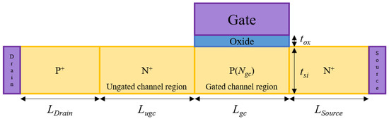 Figure 1 shows a 2-dimensional (2D) schematic diagram of NFBFET. The P-N-P-N structure was used for simulation, and the NFBFET was simulated with commercial simulator ATLAS by Silvaco [31]. Table 1 shows the structure parameter of the NFBFET. The doping concentration of gated-channel regions was variable. The material of the gate-oxide is aluminum oxide (Al2O3), and the work-function of the gate is 5.0 eV. For investigating the electrical characteristics for the NFBFET, the physical models of MOSFET and BJT were used. Those models include the transverse field dependent mobility model (CVT), field-dependent mobility (FLDMOB), Shockley-Read-Hall recombination model (SRH), Auger recombination model (AUGER), bandgap narrowing model (BGN), and Fermi-Dirac calculation model (FERMI). Additionally, for considering the tunneling effect, the non-local BTBT model (BBT.NONLOCAL) was used. The simulation was conducted by transient analysis, and the long term of time step (~1 s) was used to investigate DC characteristics of the NFBFET.