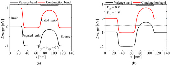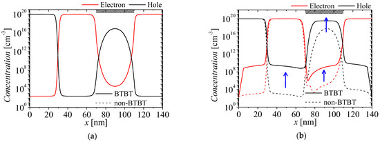 Figure 6a,b show the carrier concentrations on surface region of the NFBFET at two cases of VDSs and fixed VGS = 0 V when the BTBT is considered. The red and black lines denote electron and hole concentrations, respectively. The solid and dash lines denote concentrations with BTBT and non-BTBT, respectively. The carrier concentration of initial state is determined by doping concentration due to no BTBT currents, as shown in Figure 6a. The changed carrier concentrations at VDS = 1 V are shown in Figure 6b. When VDS increases, BTBT occurs on the surface of channel region. Excess carriers, which are generated by BTBT, are hard to flow into the electrode, owing to high potential barriers of drain and source-side junctions. Then, generated carriers accumulate in the channel region. Subsequently, accumulated carriers make the potential barrier and well of the channel region lower. Because lowered potential barrier permit injection from the source by thermal emission, the leakage current occurs. This mechanism is similar to the positive feedback.