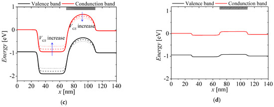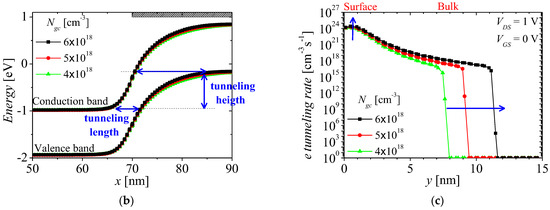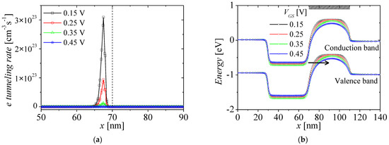 Figure 8a,b show the electron tunneling rates and energy band on surface region at VGS = 0.15 to 0.45 V with bias step of 0.1 V and VDS = 1 V. The black, red, green, and blue lines denote the electron tunneling rates and energy band at VGS = 0.15, 0.25, 0.35, and 0.45 V, respectively. The non-local tunneling process can be calculated with local tunneling process by assuming that the electric field is uniform at tunneling path [32]. When tunneling current with local process, the tunneling rate is related to tunneling length. For the Kane model, which is representative local model, the tunneling rate Gtun for BTBT is given by [33,34,35]