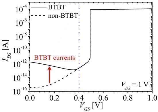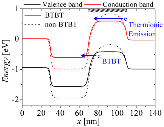 Among them, the FBFET has been attracting attention as a next generation device, owing to complementary MOS (CMOS) based fabrication and high on/off ratio. The FBFET works on positive feedback, therefore, the FBFET has approximately zero subthreshold swing and hysteresis characteristics. Utilizing those characteristics, various circuits such as memory circuits, logic gates, bio-sensors, and neuromorphic circuits were presented [11,12,13,14,15,16,17,18,19,20,21,22,23,24,25,26,27,28,29,30]. Several structures of the FBFET have been proposed to meet the desired performance for each circuit. Most structures are based on S-shape energy band (or band-modulation) at the channel region. Mostly, the FBFET has P-N-P-N and P-N-i-N structure, and the family of Z2-FET, which is works on same mechanism, has P-i-N. The S-shape energy band consists of potential barrier and well. The potential barrier controls carrier injection at gated channel region. The carriers are injected by thermal emission to adjust the gate-source voltage. Then, the carriers are accumulated at ungated channel region. The accumulated carriers eliminate the potential well, and finally the carriers flow into the other side contact by diffusion. These mechanisms make the positive feedback between electron and hole in the channel region, and therefore the energy band of all regions is aligned. When the potential barrier and well are not high enough to make S-shape energy band, the FBFET works like a diode. Therefore, to make positive feedback in the channel region, highly doped region or virtually highly doped region are required. When a drain-source voltage is applied to the FBFET, the valence band of potential barrier and the conduction band of potential well were aligned, and the band-to-band tunneling (BTBT) current can be generated. The BTBT tunneling current make potential barrier and well lower, and therefore the leakage current increases and the threshold voltage changes. So far, when investigating the electrical characteristics of the FBFET using technology computer aided design (TCAD), physical models of MOSFET and bipolar junction transistor (BJT) were used according to FBFET structure. Most studies were not considered tunneling current in the channel region. To accurately investigate the electrical characteristics of the FBFET, it is necessary to consider the tunneling current that can have occurred at the channel region.