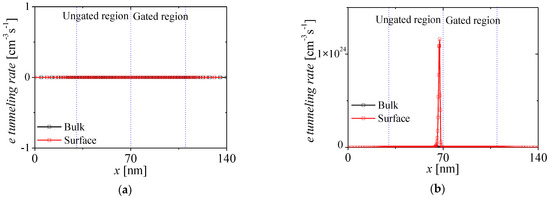 Electron tunneling rates at two cases of VDS on bulk and surface regions. (a) VDS = 0 V (initial state) and (b) VDS = 1 V.