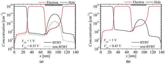 Figure 9a,b show the carrier concentrations on surface region at VGS = 0.35 and 0.45 V when BTBT is considered and ignored. The red and black lines denote electron and hole concentrations, respectively, and the solid and dash lines denote electron and hole concentrations with BTBT and non-BTBT, respectively. As shown in Figure 9a, carrier concentrations considering BTBT at VGS = 0.35 V are still some different from those ignoring BTBT, owing to remaining of BTBT at the surface. However, there is no longer a difference between carrier concentrations considering and ignoring BTBT when BTBT disappear at VGS = 0.45 V, as shown in Figure 9b. Therefore, as VGS increases, the current decreases, as shown in Figure 4. When VGS > 0.45 V, the current considering and ignoring BTBT are the same since BTBT does not exist, as shown in Figure 4.