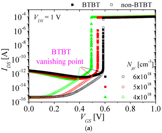 Figure 10a shows the IDS-VGS characteristics of the NFBFET considering BTBT with Ngc from 4 × 1018 to 6 × 1018 cm−3 at VDS = 1 V. The filled and empty symbols denote the simulation results for considering and ignoring BTBT, respectively. As Ngc increases, the leakage current increases. When Ngc increase, the tunneling length is shorter, as shown in Figure 10b. Hence, the tunneling rates increase according to Equation (1). Moreover, higher Ngc make tunneling rates higher on surface as well as bulk region of the NFBFET, as shown in Figure 10c. However, as VGS increases, the BTBT currents decreases by lowering potential barrier on gated-channel region with stronger gate-field, and eventually they are vanished at BTBT vanishing points, as shown in Figure 10a, and then thermionic emission mechanism becomes dominant, such as the FBFET ignoring BTBT. The BTBT vanishing point increases due to increase of tunneling rates on surface and bulk region as Ngc increases.