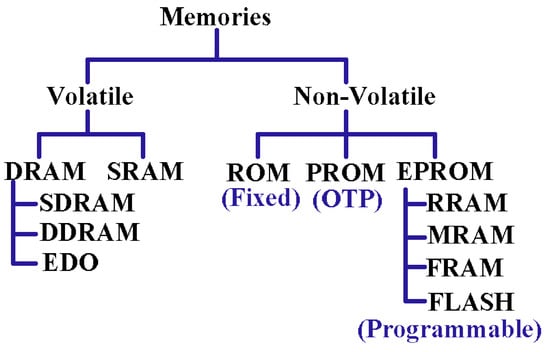Memory holds data either temporarily or permanently while processing. Two important parameters, access time and data retention, determine a memory hierarchy; faster memory placement will be closer to the processing unit. Figure 1 shows memory classifications. Several emerging nonvolatile memory cells, such as MRAM, FRAM, RRAM, PCM-RAM and FLASH, are appealing because of their improved retention time, density and performance [4,5,6,7]. However, lower latency and push-rule-based manufacturing [8] have made the SRAM cell a suitable choice for cache memory.