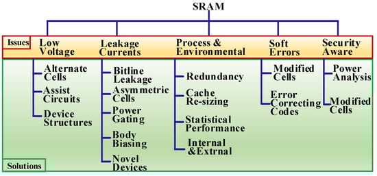 This article reviews SRAM cell design obstacles and workarounds (Figure 2). Section 2 introduces the conventional 6T-SRAM cell architecture and associated performance measurement parameters. Section 3 presents the low-voltage operation issues and available remedies. Section 4 highlights the leakage current’s significance and minimization techniques. Next, Section 5 details process variations’ impact on SRAM cell performance. Section 6 explains soft errors’ occurrence and solutions. Then, Section 7 overviews security-aware SRAM cell designs. Section 8 discusses current and future research trends. Finally, Section 9 concludes this article.