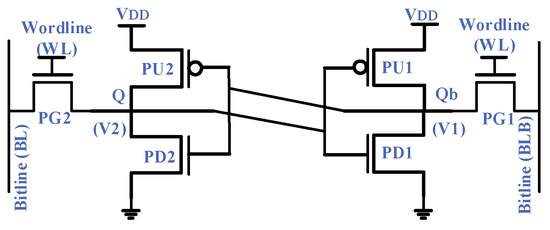 The conventional SRAM cell consists of six transistors, as shown in Figure 3. The internal nodes, Q and Qb, hold the bit value and its inverse, respectively. PMOS transistors, PU1 and PU2, pull up these nodes. Similarly, NMOS transistors, PD1 and PD2, pull down the internal nodes. The pass transistors, PG1 and PG2, provide access for the read and write operations.