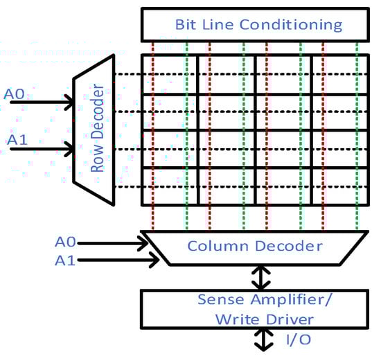 The aforementioned conventional 6T-SRAM cell necessitates the peripheral circuitry for operational procedures. Figure 4 presents the main peripheral components: row and column decoders, sense amplifiers, bitline conditioning and write drivers. The external components’ performance plays a crucial role in the overall memory design. For example, amortization reduces the number of sense amplifiers required for an SRAM cell array design [22]. Hence, an SRAM array achieves efficiency in design density and power consumption.
