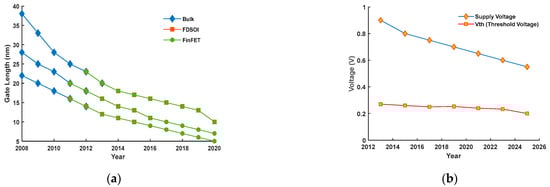 Transistor downsizing leads to scale-downs in the supply voltage. T.H. Bao et al. [23] reports feature sizes down to 5 nm as workable at the commercial scale. The international roadmap for devices and systems (IRDS 2022) predicts transistor scaling down to the 0.7 nm node by 2034. However, size minimization brings forward obstacles such as degraded sub-threshold slopes (SSs) and increased drain-induced barrier lowering (DIBL) [24]. The SRAM cell design has consequently shifted from planar devices to fully depleted silicon-on-insulator (FDSOI) [25], which permits an acceptable performance, as shown in Figure 5a. In the future, sheet or gate-all-around (GAA) transistors [26] will replace the current FinFET in the SRAM cell design.
