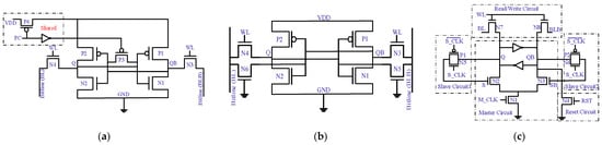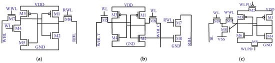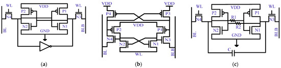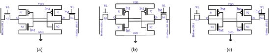 Asymmetrical 6T SRAM cells for leakage reduction using preferential state and multi-threshold voltage [43]. (a) Asymmetric: ‘1’ as preferential state; (b) asymmetric: ‘0’ as preferential state; (c) asymmetric leakage optimization.