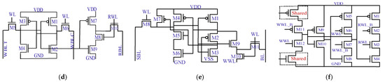 Figure 6 highlights different SRAM cells and associated control signals. Without loss of generality, the basic operation is similar in essence, as explained in Section 2. A 7T-SRAM cell, as seen in Figure 6a, has a single read-bitline (RBL) and read-wordline (RWL) for the read operation. The newly added transistor M4 breaks the back-to-back inverters’ feedback through the WL signal and improves the write noise margin. An 8T-SRAM cell, as seen in Figure 6b, separates the read-port (M7 and M8) to avoid device size conflict and thus, this cell can independently tune the read noise margin. Furthermore, a 9T-SRAM cell, as seen in Figure 6c, has a separate read and write port (M7, M8 and M9). Additionally, this cell has wordline pull-up (WLPU) and wordline pull-down (WLPD) transistors for the power gating to save power. Next, 10T-SRAM cells, as seen in Figure 6d, manifest the separate read and write port concepts as the same as 8T-SRAM cells. But the M7, M8 and M9 transistors’ buffer provides strong logic for the 0 or 1 value. The addition of M2, M5 and M7, as seen in Figure 6e, is an alternate way to furnish the strong logic value. Transistors (M9 and M10) in an 11T-SRAM cell remove interdependency between the read and write noise margins. Tri-state buffers for the read and write operations in a 12T-SRAM cell, as seen in Figure 6f, improve the read- and write-energy per cycle while the read or write operation is in progress.