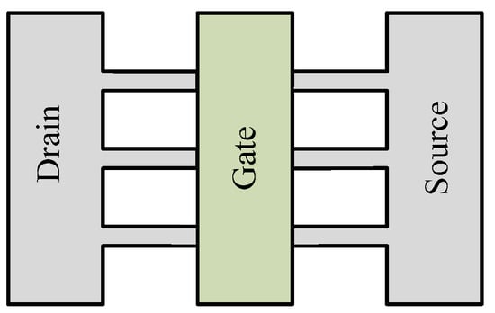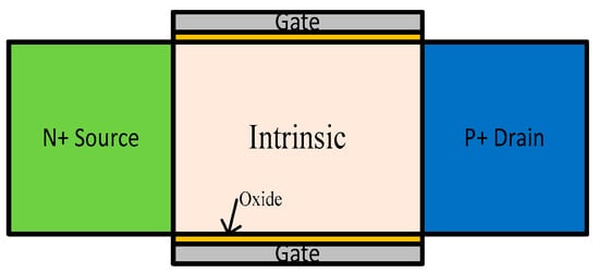 The second type of device structure is illustrated in Figure 8. It is a tunnel FinFET (TFET) with both terminals, source and drain, joined through an intrinsic channel [41] and has a doping of opposite polarities. Such transformation improves the sub-threshold factor (KT/q) and gate-work function to support the low voltage operation down to 0.3 V.