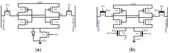 Leakage control mechanisms for SRAM cells using internal components and external control signals for raised ground levels [45,46]. (a) SRAM cell with virtual ground; (b) asymmetric SRAM cell with virtual ground.