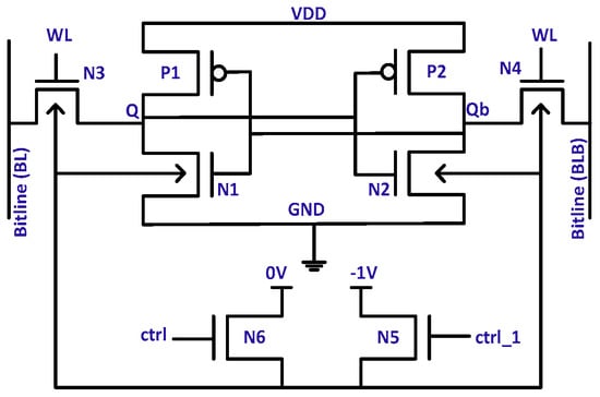 To improve the performance and leakage currents, two prevalent body biasing mechanisms are forward body biasing (FBB) and reverse body biasing (RBB). The SRAM cell [48] shown in Figure 11 exploits both techniques through N5 and N6 transistors with the external control signal ‘ctrl.’ Two transistors, N5 and N6, select voltage levels of ‘-1′ and ‘0’, respectively, to utilize RBB. In modern FinFET technology, SOI has eliminated body biasing. However, FinFET-independent gates (IG) biasing IGFET [49] offers a modulation of the threshold voltage to subside the leakage current.
