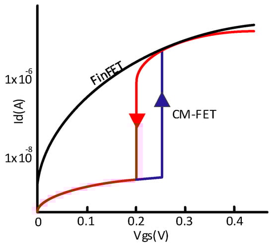 Another device structure [51], shown in Figure 13, shows improved off-state performance for the correlated-material (CM) (or hyper FET) SRAM cell. CM-FET performs the transition from the insulator to metal (ITM) and then back from the metal to insulator (MTI). The hysteresis curve in Figure 14 demonstrates the transitions of ITM and MTI from 0.20 V to 0.27 V. Th on-current of CM-FET and FinFET are comparable; however, the off-current of CM-FET is substantially lower.