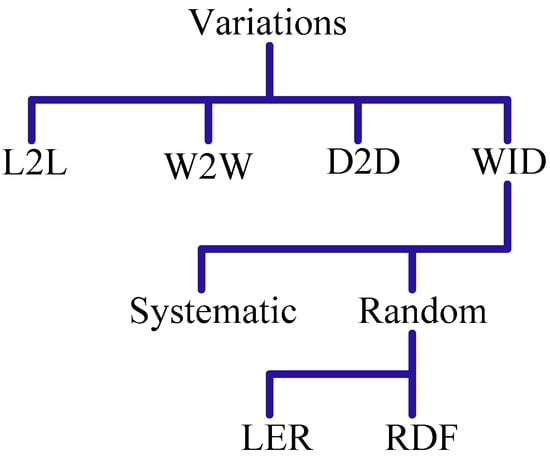 Figure 15 presents categories of process variations: lot-to-lot (L2L), wafer-to-wafer (W2W), die-to-die (D2D) and inter- or within-die (WID) variations. The L2L and W2W variations prevail within different lots of the cylindrical silicon boules and circular silicides of the same boule, respectively. The L2L and W2W effects on the circuit performance are generally minute; therefore, they are ignored quite often. However, D2D variations influence device parameters on different dies belonging to the same wafer.