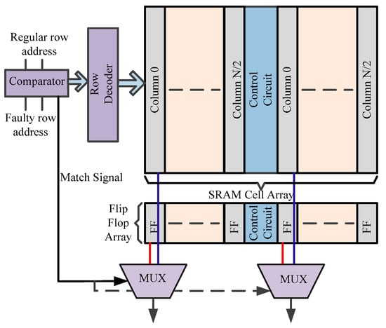 The technique proposed in [55] uses a master-slave latch instead of extra rows of SRAM cells. Figure 17 illustrates the flip-flop redundancy technique. Here, the redundant row of flip-flops, a comparator and MUX are the extra hardware components. During an operation, a comparator compares both addresses, i.e., regular and faulty. If they match, then the control signals divert the path to the redundant flip-flops to avoid faulty cells.