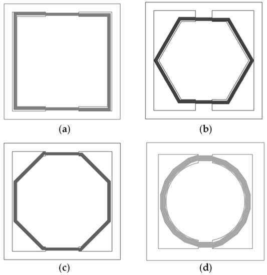 Top view of the different patterns of cantilever beams. (a) Square pattern; (b) regular hexagon pattern; (c) regular octagon pattern; (d) circle pattern.