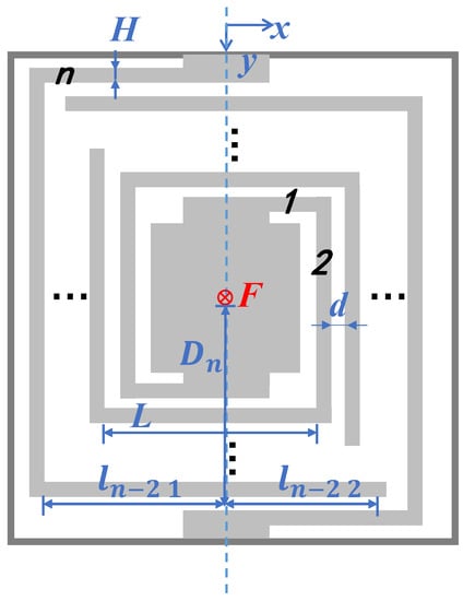 The definitions of the beam parameters in the square pattern are shown in Figure 4 and Table 1. The beams are subjected to both torque and bending moments while vibrating, so the displacement of the proof mass under force can be derived using Karl’s theorem.