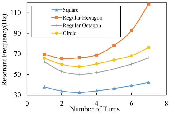 From Equations (10) and (14), we understand that reducing the width and thickness of the cantilever beams can lower the resonant frequency of the switch. However, this paper will not focus on such parameters as they are mainly determined by fabrication ability. Here, we mainly focus on the impact of different patterns. Proper patterns can increase the mass of the proof mass and the length of the cantilever beams, which also lead to a lower resonant frequency and a lower acceleration threshold, as Equation (14) shows. The resonant frequencies of the switches with different shapes of beams are calculated in MATLAB 2017 (Natick, MA, USA), as shown in Figure 5; the size of each switch is limited in 6 ∗ 6 mm; the thickness of beams and the proof-mass is set at 50 ; and the width and intervals of the adjacent beams are set at 40 and 20 separately, which are out of fabrication consideration. The resonant frequency of the switch with the square spiral beams is the lowest, while the switch with the circle spiral beams is the highest. The reason for such results is because the square spiral pattern has a lower stiffness of beams and a larger mass because of the greater utilization of space. The switch with the three-turn square spiral beams achieves the lowest resonant frequency 31 Hz, which is only 56% of the lowest resonant frequency of the circle spiral pattern.