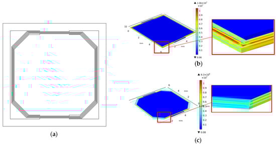 (a) Square spiral pattern with chamfers at the corners; (b) simulation results of the stress distribution of the square spiral pattern; (c) simulation results of the stress distribution of the square spiral pattern with the chamfers at the beam corners.