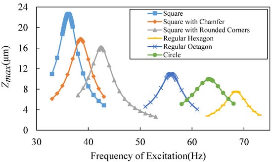 Simulated relative displacement versus different excitation frequency and beam patterns.