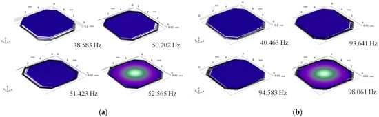 Another fatal factor that prevents the MEMS structure from resonating at a low frequency is that the first-order eigenfrequency and the second-order eigenfrequency may become too close to influence the vibration direction of the silicon proof mass. The reason for this is because the limited volume of the MEMS device makes the out-of-plane stiffness and the in-plane stiffness of the silicon beams become close. The hollow beam is used here to separate the first-order eigenfrequency from the second-order as it enlarges the in-plane stiffness of the beams with little influence on the out-of-plane stiffness, as shown in Figure 8. The simulation results of the eigenfrequencies are shown in Figure 9. The first-order eigenfrequency of the normal beam switch is 38.6 Hz and the second-order eigenfrequency is 50.2 Hz, which are too close. Figure 9b shows the simulation results after the hollow beams are used in the device. The second-order eigenfrequency changes from 50.2 Hz to 93.6 Hz, while the first-order eigenfrequency stays at around 40 Hz.