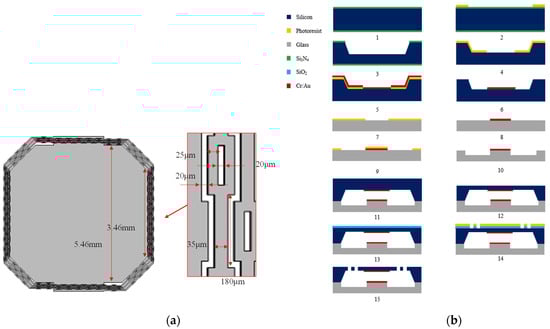 The overall device fabrication comprises fifteen steps, as shown in Figure 10. A silicon wafer with a thickness of 400 μm was used in the fabrication. After initial cleaning, the wafer was wet etched 200 μm to form a cavity for the proof mass moving. Chromium and gold were deposited and patterned on the cavity surface of the silicon wafer, with 50 nm and 350 nm thicknesses, respectively, by evaporation and the lift-off process. The size of the electrode is 3 mm 3 mm. The 50 nm-thick chromium and 350 nm-thick gold were also deposited and patterned on a 500 μm-thick glass substrate to form fixed electrodes. The two parallel fixed electrodes were designed as a special shape for better contact, as shown in Figure 1. The glass substrate was wet etched 0.7 μm in the next step in order to prevent the silicon proof mass from adhering to the glass substrate after it was released. Then, the silicon wafer was bonded onto the glass substrate. This was followed by chemical polishing in order to thin the silicon wafer down to 250 μm thickness. Finally, an inductively coupled plasma (ICP) etching was used on the silicon wafer in order to release the device forming the graphics of the switch.