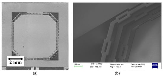 (a) Optical photograph of the resonant acceleration switch; (b) SEM of the beams of the resonant acceleration switch.