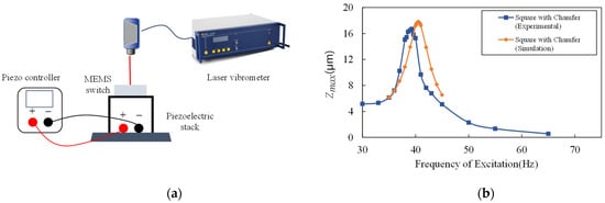 A piezoelectric stack (THORLABS, Newton, United States) and a Laser Doppler Vibrometer (LDV, Polytec, Karlsruhe, Germany) were used to measure the dynamic behavior of the switch. The LDV system measures the out-of-plane absolute displacement of the proof mass when the device is excited by a piezoelectric stack. The input voltage of the piezoelectric stack is recorded at the same time in order to calculate the absolute displacement of the substrate. The experimental set is shown in Figure 12a. The relative displacement can be calculated by the absolute displacement of the proof mass minus the absolute displacement of the substrate.