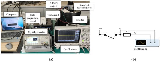 The electrical performance was tested with the apparatus shown in Figure 13. The switch was affixed flatly on the moving element of a BRÜEL & KJÆR Mini-shaker Type 481. The direct current power source and the reference resistor were connected to the switch in series to measure the electrical characteristics, as shown in Figure 13b. The switch is closed when the voltage on the reference resistor is over 2 V, while the voltage output of the power source is 3.1 V. The minimum acceleration when the switch is closed is the acceleration threshold.