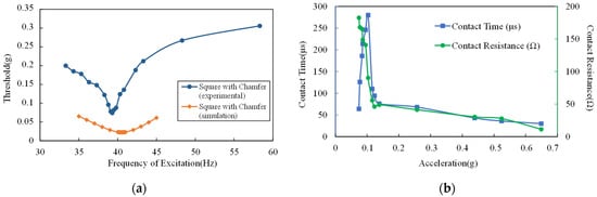 (a) Comparison of the simulation result and the experimental result of the acceleration threshold versus the excitation frequency; (b) experimental results of the contact time and the contact resistance versus the excitation acceleration.