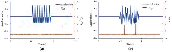Experimental result of the voltage across the reference resistor and the excitation acceleration in time domain: (a) 25 Hz and 50 Hz excitation; (b) 25 Hz, 40 Hz and 50 Hz excitation.