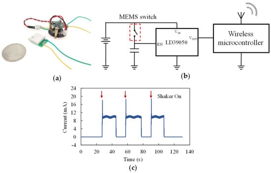 (a) A picture of the resonant acceleration switch connected with a sensor node; (b) circuit schematic of the sensor node; (c) test result of the sensor node’s power supply current.