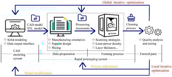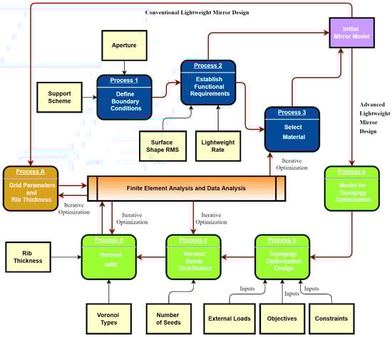 Additive manufacturing (AM) from bottom to top and with layer-by-layer printing has completely changed the conventional method (Figure 1). It dramatically reduces the difficulty of manufacturing complex structures and derives a new design method, design for additive manufacturing (DfAM). The core technology of DfAM is simulation-driven optimization design technology, including creation-based design technology, topology optimization design technology, lattice design technology, parameter optimization design technology, and simulation analysis technology []. DfAM can redesign the whole part to maximize the advantages of AM. Advanced lightweight mirror (ALM) is a new-type mirror that was designed combined with AM and DfAM. AM and DfAM can improve the freedom and structural innovation for designing mirrors, along with a reduction in lead time.