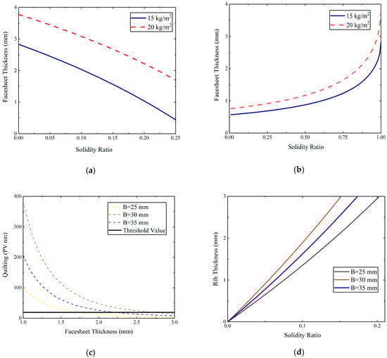 (a) Solidity ratio as a function of facesheet thickness. (b) Quilting deflection as a function of facesheet thickness. (c) Quilting deflection as a function of facesheet thickness. (d) Solidity ratio as a function of rib thickness.