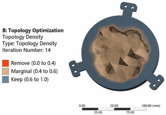 A 30% residual volume was set as the response constraint. After 14 iterations, the optimization curve gradually converged to a stable value. Additionally, the topology optimization result is shown in Figure 7. The relative density of materials can determine the structural configuration. During the optimization process of the variable density method, the elements with a relative density less than 0.4 were removed, and the elements with a relative density greater than 0.6 were kept. The distribution design of marginal area with relative density between 0.4–0.6 was critical, which will be discussed later.