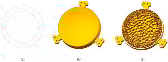 The seeds in the surface support and dense external areas were more than those in the sparse internal area. The number of seeds in the surface support and dense external areas was 200, yet the sparse internal area was 100. The seed distribution is shown in Figure 9a. With each seed as the center, the polyhedrons are indented in proportion to generate the volume models. Due to the limitations of the minimum wall thickness, 3D-Voronoi cell sizes were controlled within a certain range.
