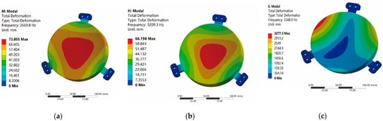 Results of first-order modal: (a) honeycomb mirror; (b) 2.5D-Voronoi mirror; and (c) 3D-Voronoi mirror.