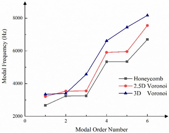 Modal analysis is to solve the natural frequency and vibration mode of the mirror. The results are critical indicators for evaluating the dynamic stiffness of mirrors. The resonance between optomechanical structures can be avoided after modal analysis. Modal analysis can also obtain the stiffness characteristics and serve as the input conditions for other studies, such as harmonic response analysis and random vibration analysis []. These analyses play a significant role in the evaluation of structural design schemes. The modal frequency is negatively correlated with the mass because both the final Voronoi mirrors are lighter than the honeycomb mirror. We adjusted the models slightly for accurate modal analysis to realize the equal group.