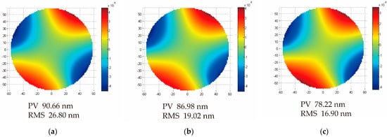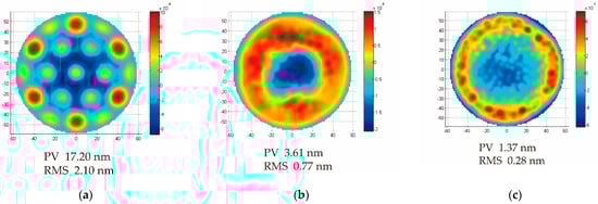 Surface shape fitting nephograms after the post-polishing analysis: (a) honeycomb mirror; (b) 2.5D-Voronoi mirror; and (c) 3D-Voronoi mirror.