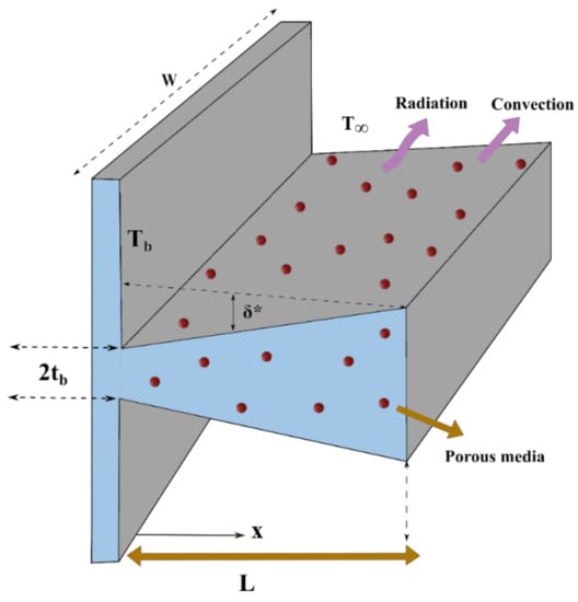 The steady-state heat passage of a porous DF with internal heat generation is conferred in this model, as displayed in Figure 1. Heat is dissipated from the fin’s surface to the ambient environment at temperature via convection and radiation. The permeable medium is assumed to be saturated with a single-phase, homogeneous, and isotropic liquid. Heat exchange occurs in a permeable fin due to heat conduction and thermal radiation transfer heat from the adjacent side. Transfer of heat energy is due to natural convection that occurs when the fluid’s mass flows through the porous structure.