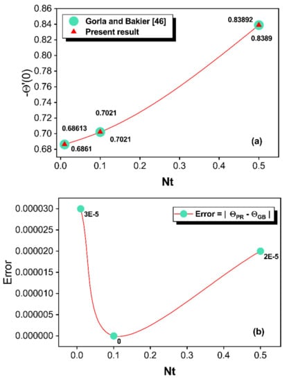 The comparison of the current analysis to the available result exhibits an excellent agreement with a maximum error of 0.00003. This analysis can be studied in detail by considering the graphical structure. Figure 2a indicates a comparison of the current numerical scheme with that of Gorla and Bakier [] by taking , , and . In this figure, the value of is compared by setting the and values to 1 and 0.1, respectively, and also depends on the varying values of . From Figure 2a, an appropriate consistency between the data from this analysis and those published in Ref. [] is observed, implying that the numerical technique for the simulation is accurate. Observations indicate an improvement in heat flux as a result of an increment in , which is the ratio of ambient temperature to the difference among the base and ambient temperatures. The physical justification is that greater emission of heat into the environment is correlated with higher scales of , which causes the thermal distribution to decrease and heat flux to augment. Figure 2b is provided to estimate the error between these comparisons using the correlation . According to the comparative outcomes, the maximum deviances are identified for (see Figure 2b). Furthermore, the comparisons and error estimations show that the SCM has good accuracy due to their exponential convergence.