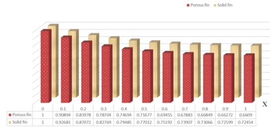 The primary difference between solid and porous fins is the presence of an extensive number of pores involved with the permeable fin, which permits liquid to flow via these holes. Based on the current examination, Figure 3 is designed to demonstrate the thermal distribution and heat transfer rate in porous and solid dovetail fins as a component of fin length. At , the thermal profile for both solid and porous dovetail fins attain their maximum value, and the temperature profile shows decreasing characteristics as the ranges from 0 to 1. In other words, the temperature is maximum at the fin base and gradually reduces from there to the tip. Finally, there will be less temperature distribution at its tip. The porous fin has a lower thermal distribution than that of the solid fin owing to the occurrence of a large number of pores that allow fluid to flow through the holes. Consequently, a porous fin offers a greater rate of heat transmission than is achieved with a solid fin.