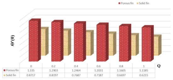 Figure 4 delineates the variation in thermal flux for increased values of and also elucidates the comparison between solid and permeable fins. From this figure, one can notice that the thermal gradient decreases with enrichment in for both kinds of fins. Moreover, the heat flux is more for permeable fin compared to solid fin.