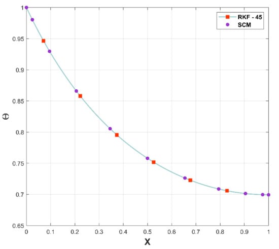The SCM is a numerical method for more rapidly and effectively solving nonlinear differential equations. It has advantages over traditional finite difference approaches, including the ability to perform faster convergent approximations. The major purpose of plotting Figure 5 is to determine the accuracy of the considered numerical method, SCM, by comparing with RKF-45. As a result of the comparison of the two methods, an excellent pact has been recognized in the figure.