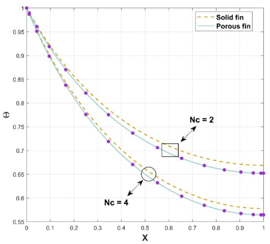 For lower variability in , it is found that the heat flux enhances. The fundamental notion for using permeable fin is to enhance the efficacious surface area through which heat is convected to the nearby liquid. Even though the effectual thermal conductivity of the permeable fin weakens due to the discharge of solid substance, this decline is balanced by an expansion in surface area. As a consequence, increased porosities significantly augment the heat transfer rate. As predicted, improving augments radiation heat exchange through the porous fin.