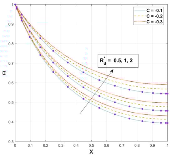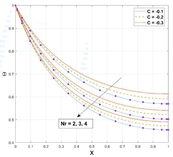 The deviation of the thermal field for the different coefficients of has been embodied in Figure 7. This figure reflects that the temperature field diminishes with corresponding augmented values of . The enhanced radiation results in effective heat dissipation from the fin surface to the adjacent fluid, as implied by the steadily declining temperature in DF. As an upshot, heat energy transmission induced by radiation proliferates the rate of heat transfer from DF.